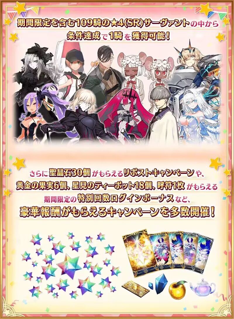 更新: 1. 连续登录奖励中的四星狗粮变为五星 2.素材交换券三选一变五选一 3.从者和礼装强化大浪费概率2倍 4.狗粮本的AP消耗量限时减半,且助战宇宙凛限时登场 5.所有自由关卡首次通关为止的AP减半 6.绿方块商店增加五星狗粮,四星狗粮消耗40变为15 7.绿方块商店加入新加成礼装 8.宇宙凛灵衣加入灵衣缝制,通关终局特异点后可免费交换 9.可以一次使用多个苹果至满体力 10.每日连续登录奖