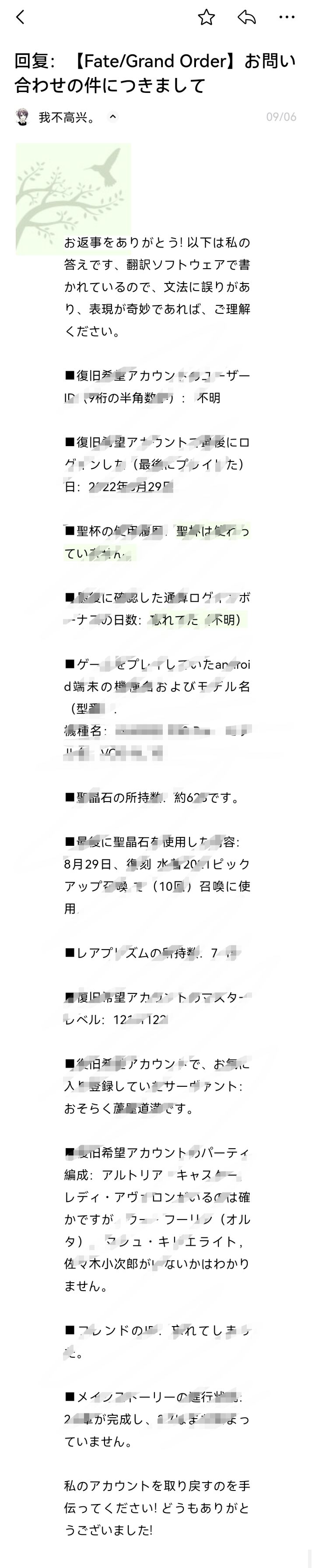 大概在8月31日的时候,我因为没有生成新的引继码把账号给丢了,之后重新下载重新登陆就完全登不上去。然后就按照百度教程去填写官网上的表格。其中有一项是账号的ID,我一开始以为就是引继码的意思。然后看网友说,只要有id找回几率就很大;别的项目如果记不清了千万不要瞎写,就填忘了。然后我很多都不太敢写,都写忘了,就这么交了上去。结果第二天早上就收到了回信,说找回失败,让我再多提供一些信息,其中包括id