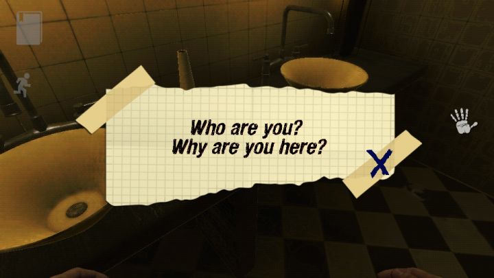 因为是demo版本所以不能存档好了!我们进去正题!一开始你会在厕所醒来,然后你一脸懵逼的看到洗手台上面的字条!上面写着:【who are you.?why are you here?】( 你 是 谁 你 为什么 会在这里)吐槽一下(๑¯ํ ³ ¯ํ๑)!这个应该不是主角写的,我怀疑是某个小姐姐!然后电话来了!叮叮叮!是你叫的客房服务吗!啊咧,没有啊?( づ ωど)要不你进来陪我玩?然