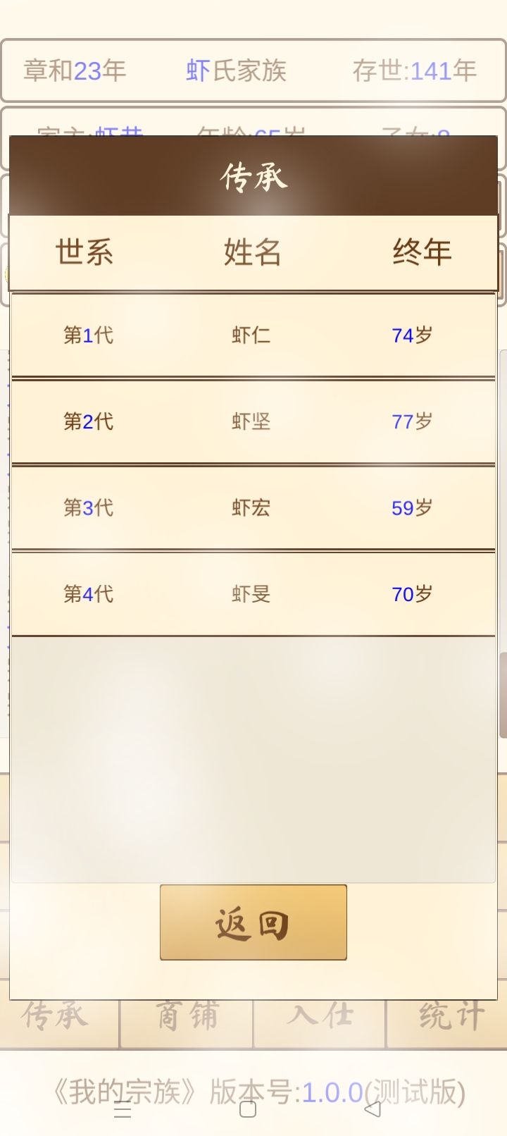 传承了第5代家主 每一代娶媳妇的标准400属性当儿媳第5代家主的母亲因为属性很高所以才90多才去世第一代到第5代的子孙本家的都超过500属性选媳妇的标准必须是五百属性没有500属性就选400传承的很稳我的目的传承100代达成游戏中的成就我发现了游戏中正一品的官阶只有280文最高工资就只有这么少家族多人当官收入一下子就多了起来#我的宗族
