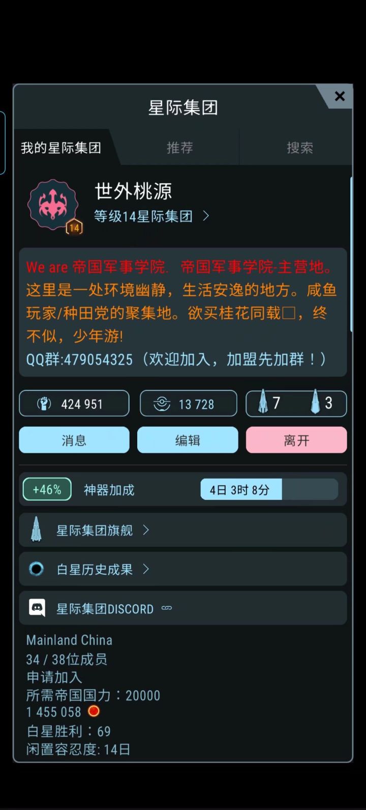 本集团历史悠久,起源于“中华银河帝国联邦(中帝联)”。现有新手入坑教程,红星模组推荐和完善的福利体系。主营地每次红活均能进入前百,R8及以上玩家入团后有机会在红活期间一起获取前百水晶奖励。常驻萌新(入团时间七天+)货船第一次升级到8t时,可凭借截图证明领取6个r9(6个r9中包括一个绿色r9和五个杂色r9)“该神器可用于解锁时间放缓”常驻成员(入团时间七天+)货船第一次升级到20t时,可凭