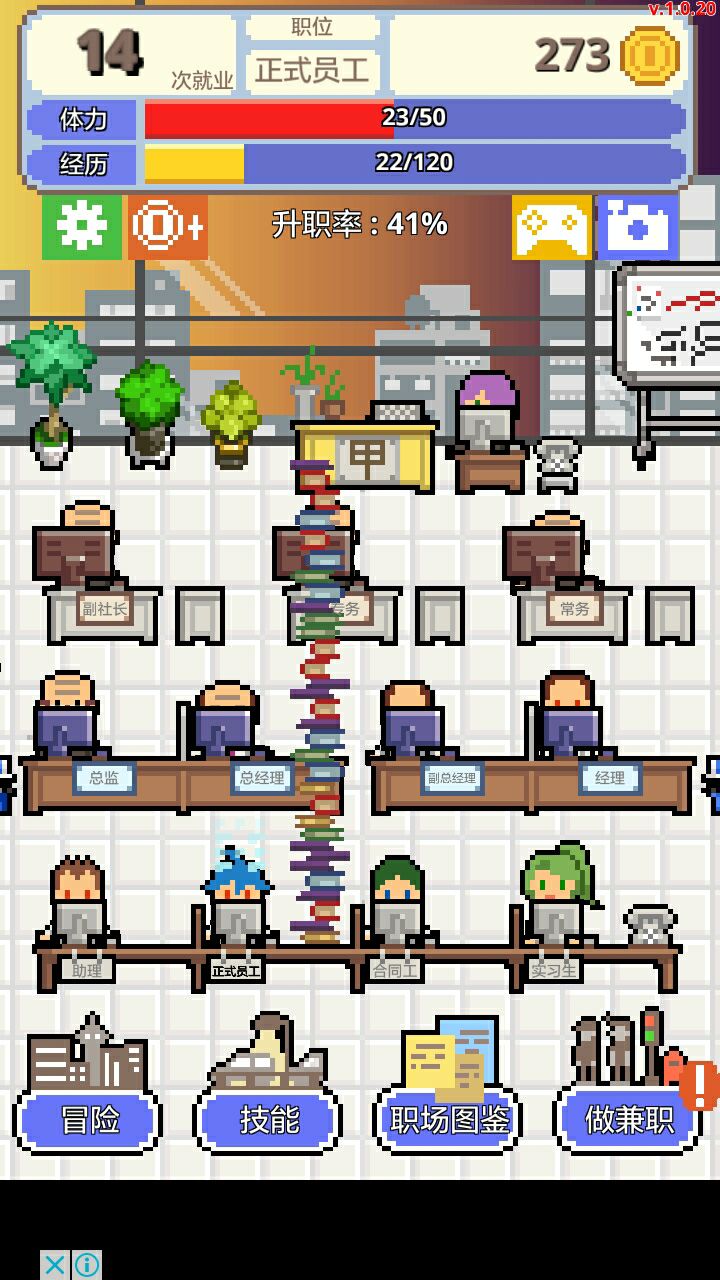 每次到合同工就去冒险,次数没了就改时间,最后冒险成功几率都是99.9%,赚来的金币买新的冒险,因为前7个冒险购买所需的金币都是上一个冒险成功得的金币的20倍左右,所以不是很困难。买第8个冒险(成功不加钱,加2%升职率)后就可以轻松刷升职率,钱也来的很快,同时冒险也会得经历(第2,4,6个冒险分别加10,30,50经历),可以更快升职。