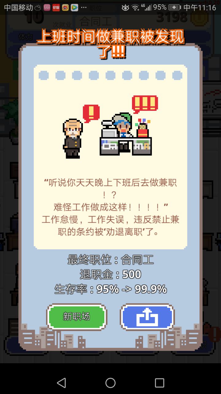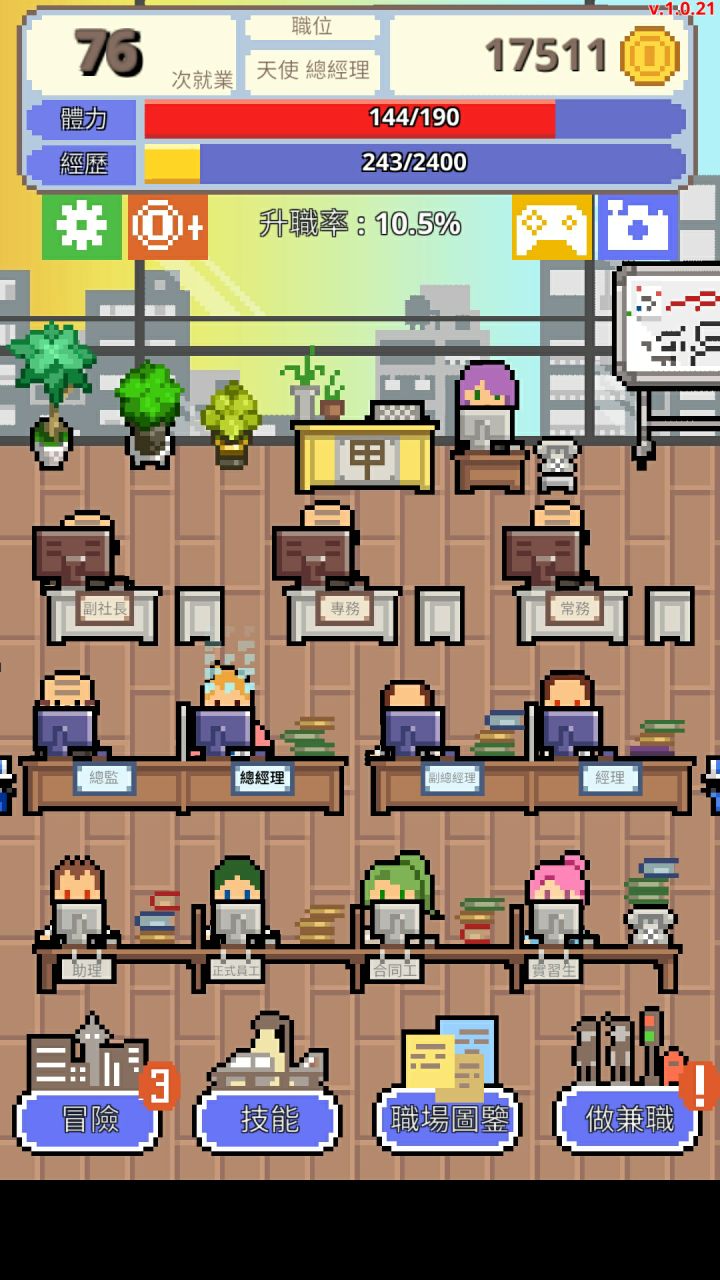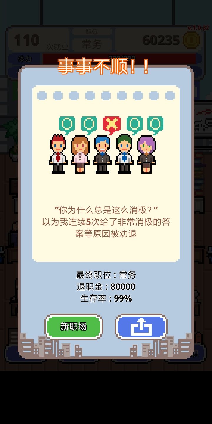 游戏创意和各种情景设置都蛮不错的,前期奋斗升职也还挺有意思,但是从经理开始,自己经常是无工作的状态,下属的速度也不快,升职需要的经验却成倍增长。时间太长而且游戏没有离线和挂机,到了管理层反而无聊起来。成为管理层之后反而没有下属来讨好这种体验差评,这种随机事件可以加起来。另外成为上司之后只能无止境的克扣下属,不克扣就是跟自己过不去,而且跟下属喝次酒500就没了,感觉人都要死了。其次兼职根本没法做,