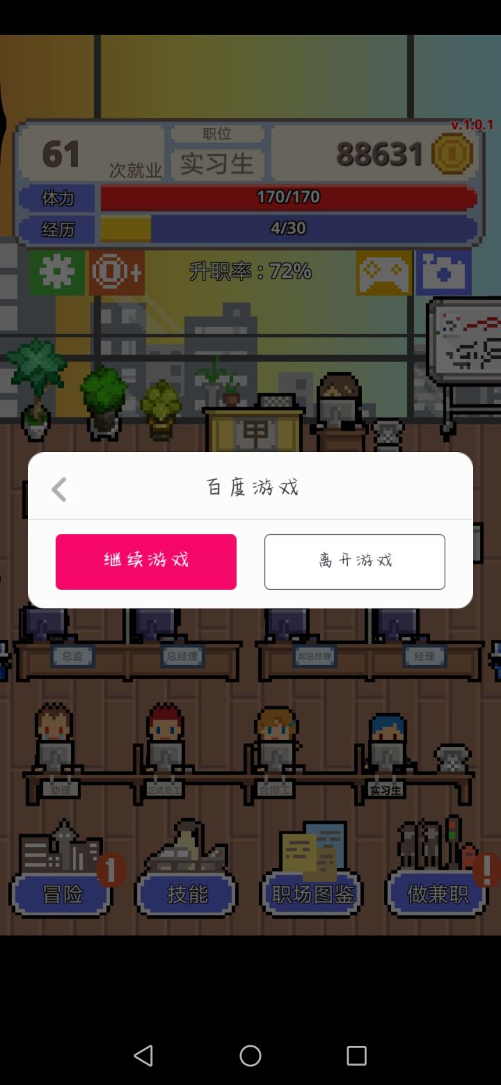 这个第16个辞职理由我搜了一下好像是提早下班,要按返回键。但是我按了返回键他弹出来的并没有下班选项要怎么达成?我是安卓的手机
