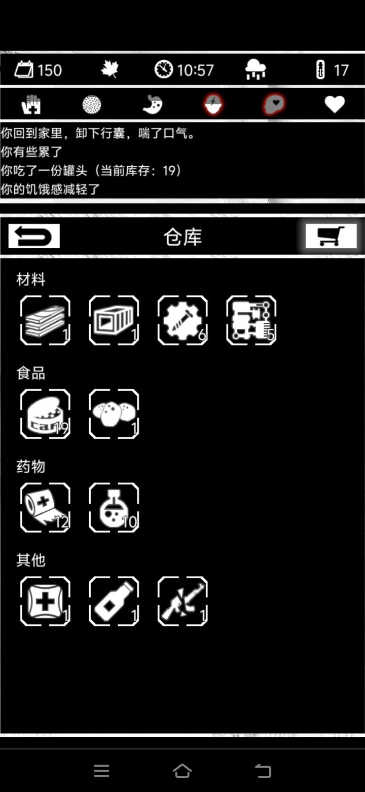 别犹豫直接加油站,抡拳头打通后点击全部拾取,点击胃,吃一个罐头。回家做出斧头,装备好打便利店。