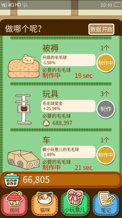 这是lz全开之后的截图,也可以算是通关了吧?猫猫和小玩意儿的全图鉴在另外两个集合贴里,欢迎大家围观嘛,玩法是比较单一的,不过每天撸撸猫其实很惬意主要有以下几点关于升级的心得首先说小玩意儿它们升级的数据是叠加的,满级100,生产一次有30s的CD且CD不通用前期小玩意儿的作用比猫猫大的多,随手升,不用犹豫玩到后面随着小玩意儿种类的增加,房屋里面是摆不全的不过呢,那些没有摆放出来的Bu