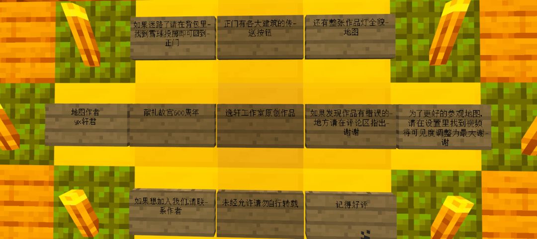 假期余额所剩不多啦~来不及出去玩?那不如看看史莱姆带来的一款超“豪华”的地图组件吧!各位冒险家足不出户也可以漫步在金碧辉煌的“紫禁城”,游玩多久都可以呢!快来康康吧~ 组件:概念世界轩都【明紫禁城】 作者:逸轩工作室 版本:手游版 进入组件,我们直接来到了作者留下的告示牌区域,这个空间已经带来雍容华贵的感觉了~ 开始游戏,我们就来到紫禁城城前,可以看到紫禁城的全图建筑地图 并且还有传送按钮,想去看