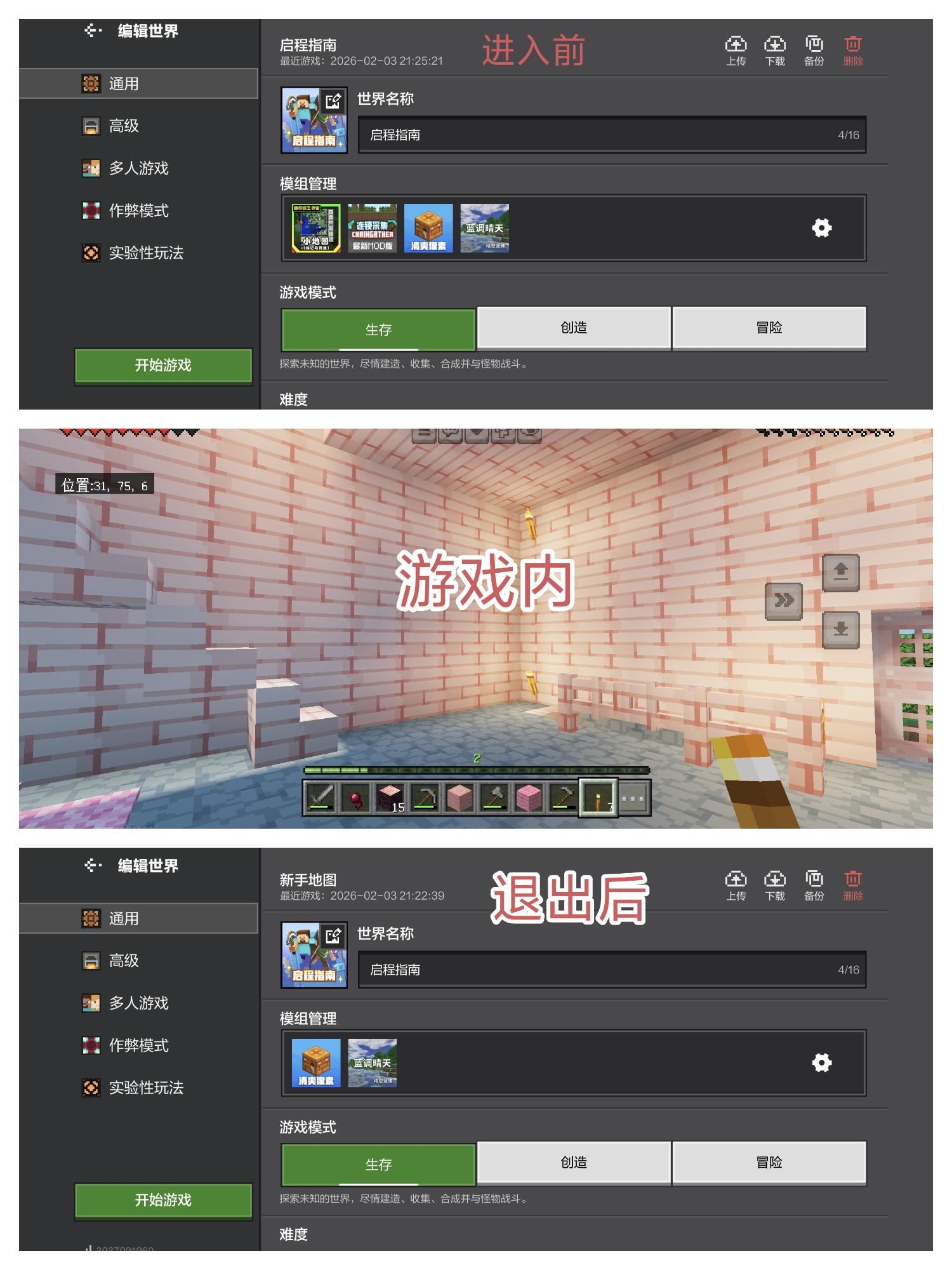 想问一下各位大佬,图一是我正在玩的世界,添加了功能和光影模组,但是只显示光影模组我又弄了一个图二的测试地图,同样添加的功能和光影,但都会显示,两个地图按钮基本上都开的一样啊,究竟为什么第一个显示不了功能模组呢下载的tap版#我的世界模组