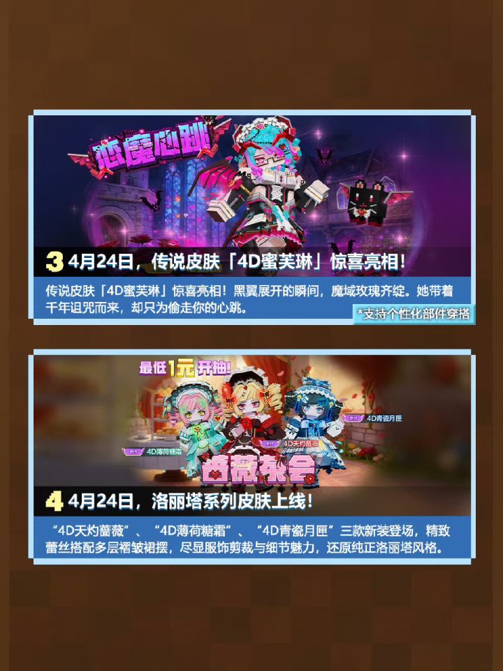 4月21日版本大更新来袭!天空之约新活动、全新官方模组池、多款限定新皮肤+存档体验优化一次全上线,新手老手一眼看懂全部重点⬇️ 新活动:天空之约,全新云端冒险主题活动开启 1.史诗全新4D乐天儿冒险皮肤同步上线,云端冒险家少女造型自带专属故事人设,还有限定头像框、专属随身配饰全套内容2.同期上新超值周卡/月卡,最高3倍返利 全新全套限定皮肤: 1. 传说品质哥特恶魔皮肤 4D蜜芙琳,
