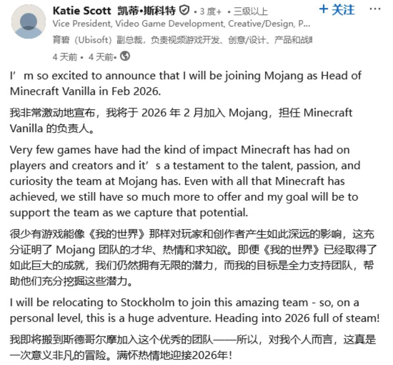 近日,育碧全球创意办公室副总裁Katie Scott在领英上宣布,她将于2026年2月正式加入微软旗下《我的世界》的开发商Mojang,担任原版《我的世界》项目负责人,并将前往瑞典斯德哥尔摩工作。她在领英发文称“即便《我的世界》已取得巨大成就,我们仍拥有无限潜力”。 Katie Scott在游戏行业经验丰富。她从育碧起步,最初是动画美术师,之后在EA担任游戏设计师和技术设计师,参与了多部《FI