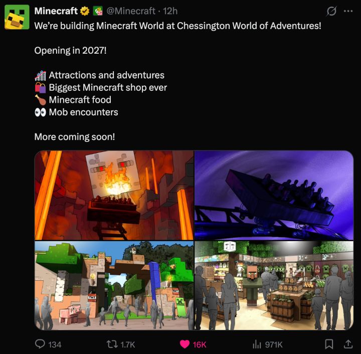 Mojang Studios今日在Minecraft Live线上发布会宣布,与全球主题乐园巨头Merlin Entertainments合作,打造《我的世界》首个大型主题乐园"Minecraft World",预计2027年在英国伦敦切辛顿冒险世界度假区开园。这个耗资5000万英镑的项目,将成为《我的世界》IP首次大规模实体化落地,也是Merlin集团"Adventures Made Real
