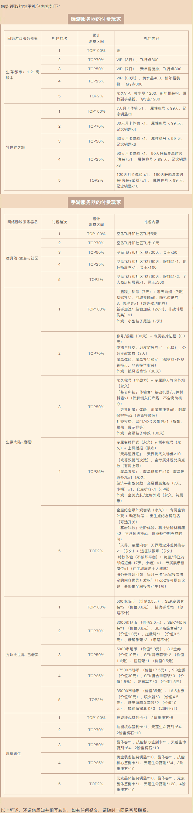 大的来了家人们!近日 网易我的世界官宣要停掉大批网络服务器了。这事儿一出立马引来不少玩家讨论。 官方表示1月16号之前,这些服务器会慢慢关掉充值功能,玩家没法再充钱。1月30号开始,就彻底登不进这些服务器了。到2月6号,服务器会正式下线,连入口都直接关掉。对于那些曾经在这些即将关闭的服务器上付费的玩家来说,网易将提供补偿。补偿将以“继承礼包”的形式发放,玩家将在2月3日之后收到邮件通知。礼