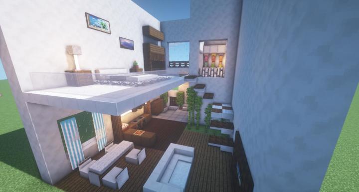 哈喽冒险家们~今天史莱姆突然想到,教大家建了那么多漂亮房子,但是却没有做过一期完整的内饰教程~最最最贴心的史莱姆这么可以让大家的漂亮房子里缺少高大上的内饰呢?于是这期史莱姆决定给大家分享一个完整的房屋内饰做法,冒险家们赶快学起来吧!首先搭建出地板部分,玄关处地板为平滑石头,卫生间地板为铁块,客厅和厨房地板为云杉木板~在錾制石砖上搭建13格平滑石英~如图,在距离地面六格的地方铺上长度为六的石英