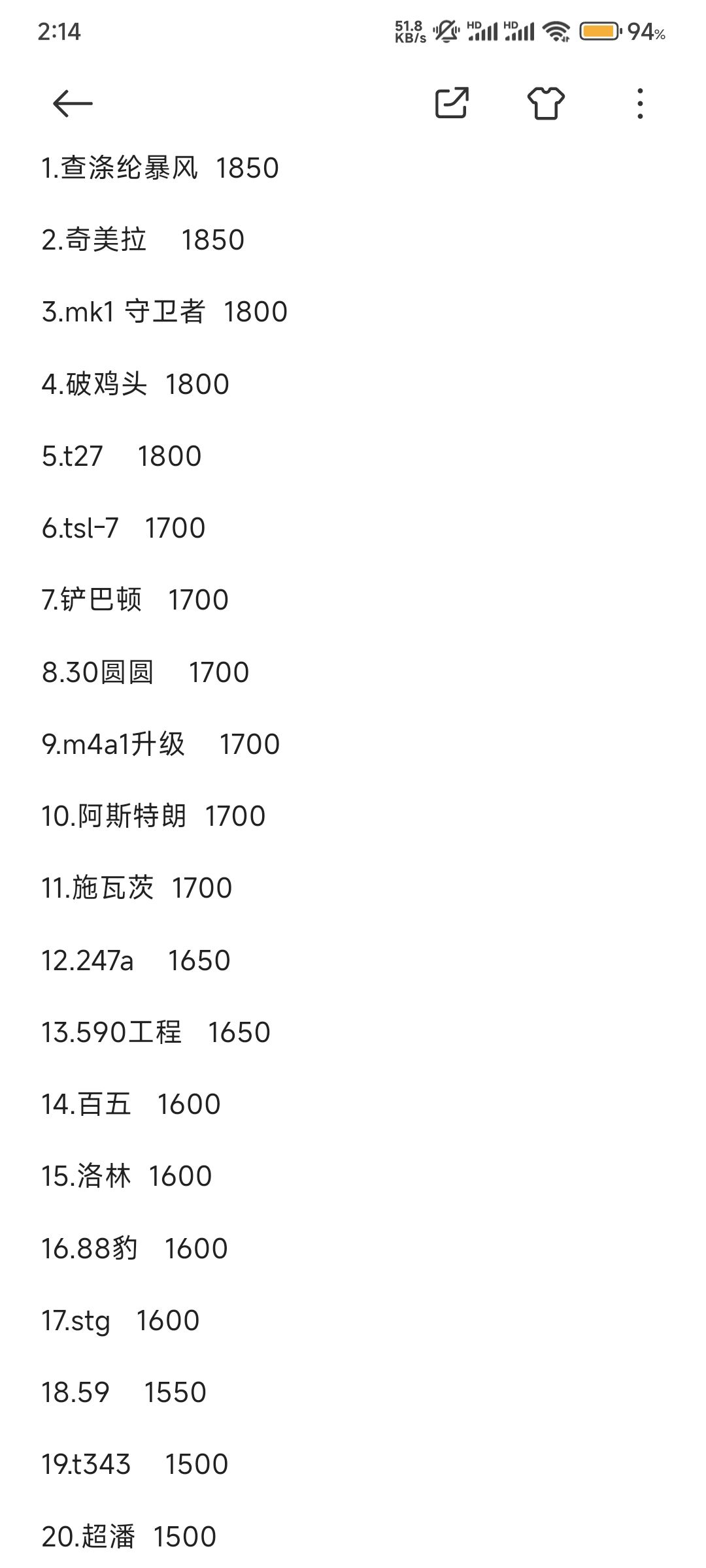 我按百场胜率60-65的玩家平均局均伤看的,暴风是第一大概1850奇美拉1800百夫长d1800破鸡头1750维克斯1700.590工程1700百夫长五1600#坦克世界闪击战 #坦克 #游戏讨论