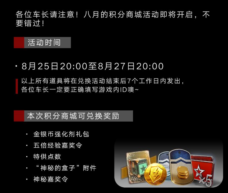 尊敬的车长, 在上周开展的春季福利周-积分商城上新的活动中,因为商城系统异常导致部分道具兑换限制出现问题,在此为给各位车长造成的困扰深深鞠躬,真的非常非常抱歉! 对于多次兑换同一档奖励的车长,将会按照活动规则,保留第一次兑换的奖励并进行发放,所有存在多次兑换的车长所消耗的积分,已自动返回至原积分账户。车长们兑换的奖励将会尽快发放到账,请各位车长及时登录游戏查收哦!