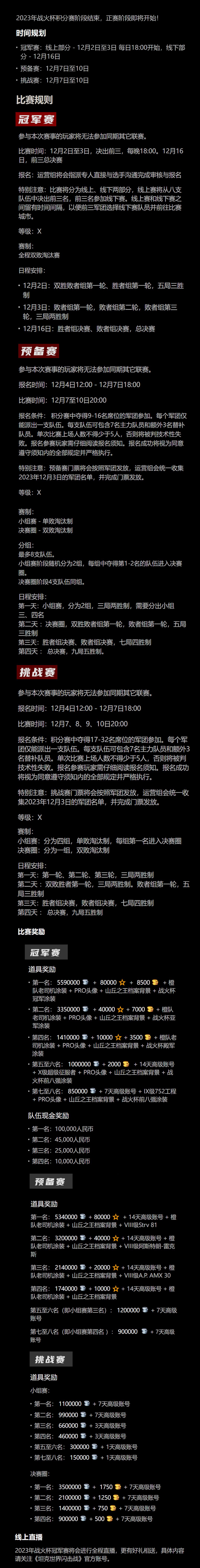 叮,您有一份战火杯观赛指南! 时隔3年后的首次线下,战火杯2023总决赛明晚正式开赛,邀请车长莅临观赛! 四大平台全程放送,四大解说精彩呈现,四轮奖励福利尽享 1CT、-TOP-、CHARD谁能捧起战火奖杯? 神秘嘉宾空降现场,为三支队伍带来怎样的惊喜? 2023个我全都要奖励,归属哪位观赛车长? 战火杯2023,我们来了! #坦克世界闪击战##WOTB##战火杯#