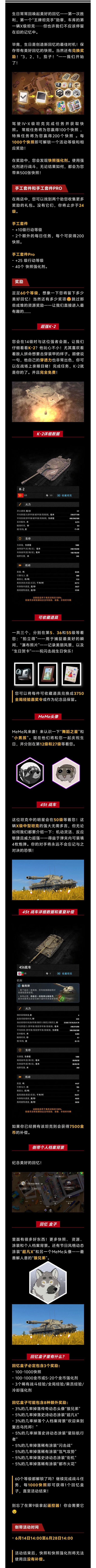 欢迎车长们光临!这地方真不错,非常适合伙伴聚会庆祝生日。这里有您需要的一切:翻滚的海浪、鲜甜的水果,还有......绝佳的坦克!6月24日到7月4日,请尽情享受休息时光,并抢购新坦克:IXBZ-58-2、大量集装箱、充满夏日气息的档案背景等!你需要做什么?你需要优惠券来获取奖励。您可以在金币礼包和坦克及资源礼包中找到它们。收集优惠券并在神秘货物活动主界面兑换奖励:坦克、个人档案背景、头像、