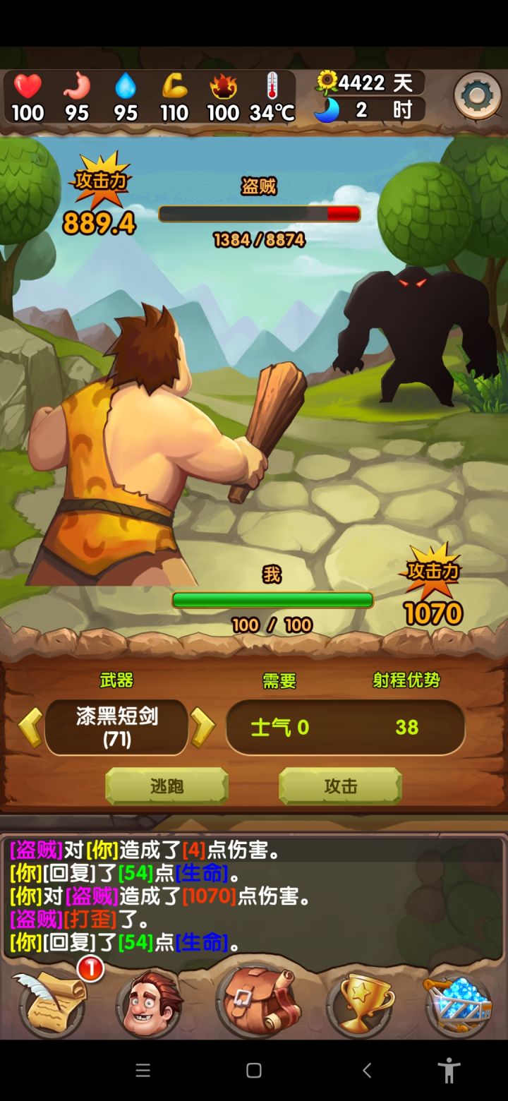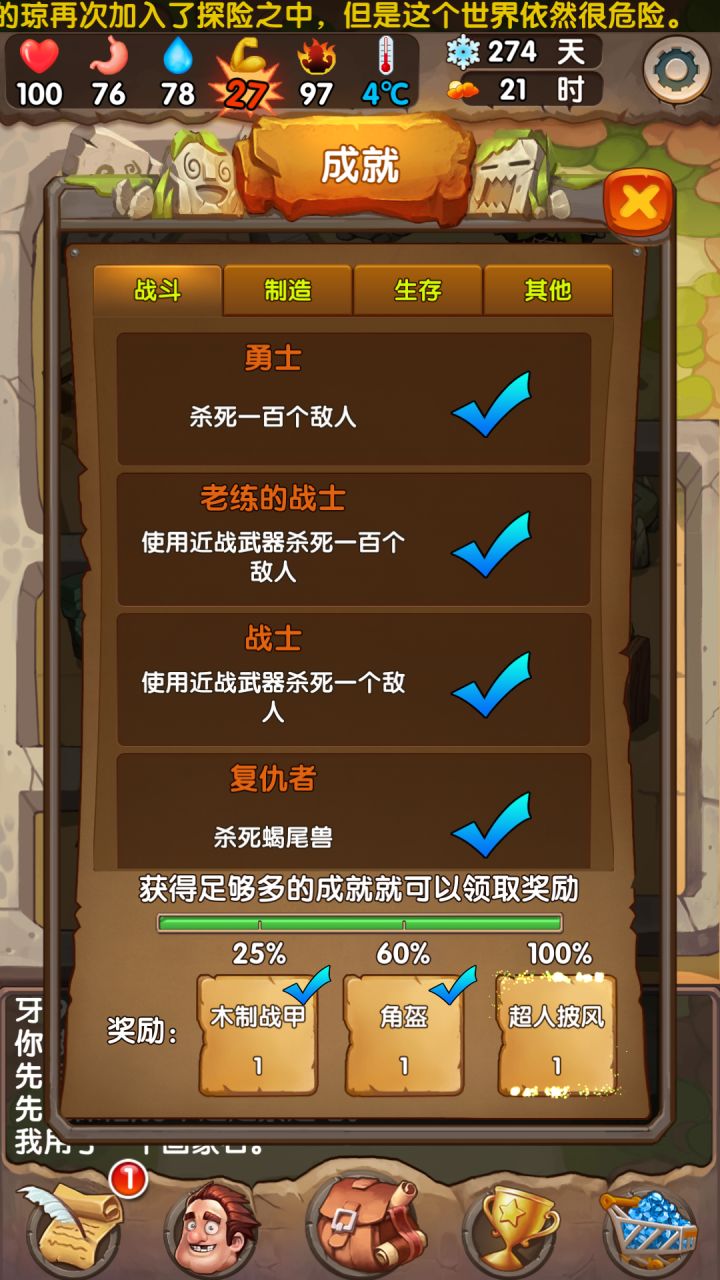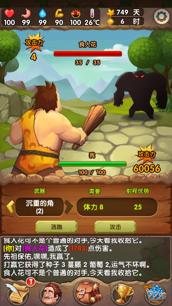 本以为文字类的生存游戏不会很大,但是玩起来却占了一百多兆的数据内存,活了两年已通关,没死过,谈一些小经验。每个季节是30天,初始季节是秋季。前期的收集和战斗就不必多说了,注意身体数据就好了。尽量避免低状态去工具台捶捶造造,因为前期制造时间都不是很短。药台不着急升,前期搓点生命药剂就好。前期武器就用长枪就好,我不喜欢远程武器,因为弹药还要占一格背包。第一个秋天要开好田,只种树。陷阱随意吧,活这么久