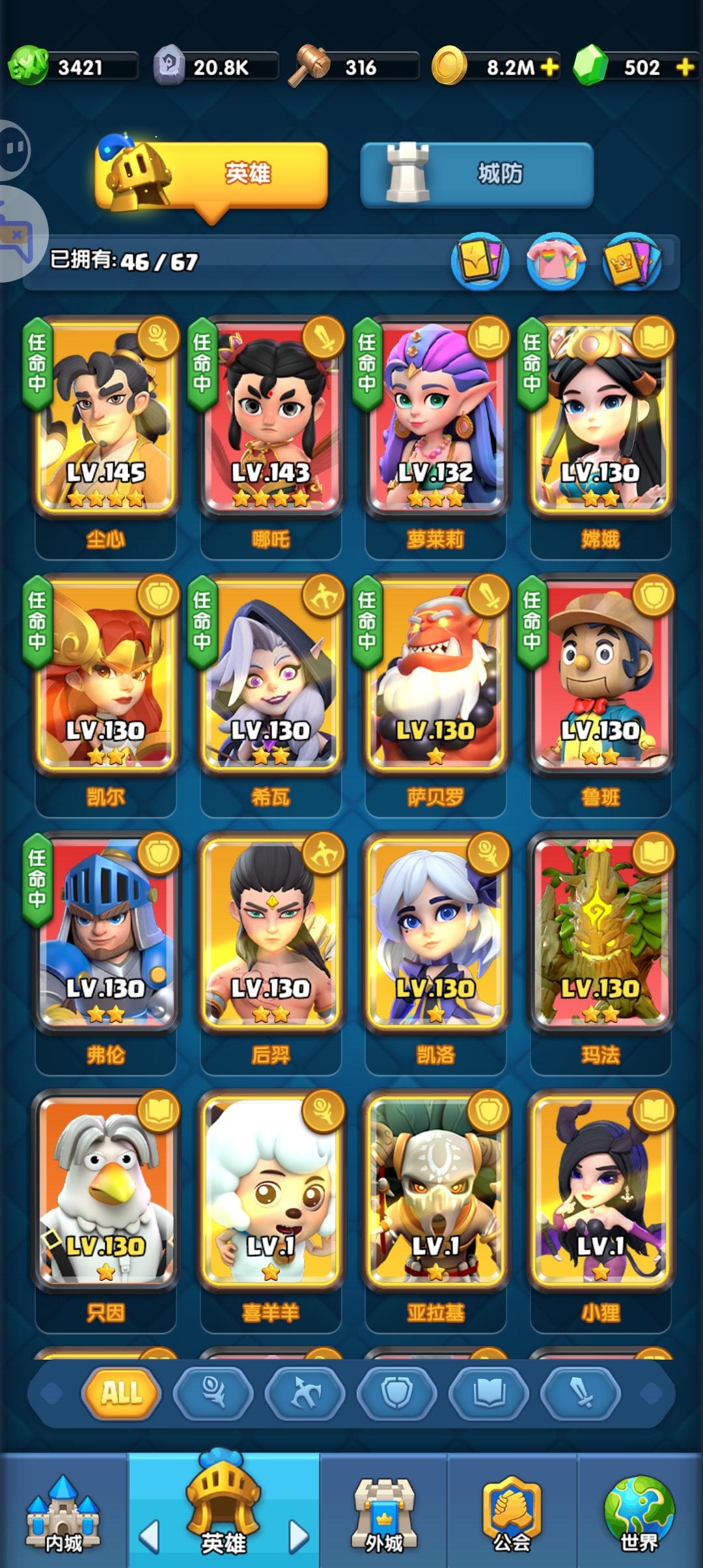英雄总计59名,单个英雄有升级、升星、装备、转职和符文几条养成线。最大上阵数量根据城堡等级逐渐解锁格子,最大应该是9个上阵位。