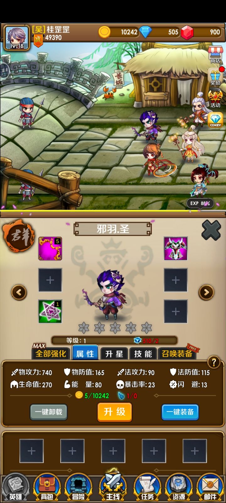 英雄界面介绍太少,为何英雄只会普攻(不知是否升级解锁,由于没灵魂石没法升级),有些被动描述的加1000生命应该是错误文本!装备强化也没说明,装备如果加100,强化5就是500+初始100(一开始我还以为无效呢,实际是每强化一次装备强一倍)看广告没双倍,没修复前别看广告,浪费时间灵魂石,升星石产出未知,召唤石使用条件未知(可能是等级没到)目前看来该游戏是半成品