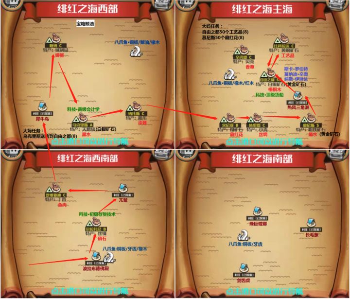 Ⅲ.绯红之海剧情流程(7个科技…路线有点复杂)科技顺序:经商——西南→西→主(郑和)(先)装甲——西北→北→东北→东(后)这里的箱子、海怪、海盗,照旧不碰东南、南、西南!到绯红的目标:至少一艘3级郑和满仓,卡拉克继续在岗。a.绯红西南(续风暴金斯瓦)村庄→尔拉托尼(接支线、科技)→村庄罗维亚迪(做支线)→b.绯红西部村庄→喀纳(接支线)→乌克里斯(做支线、科技、大妈)→