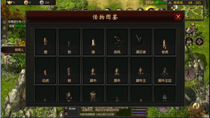主页朋友们好,本期为大家介绍一下每一个阶段的攻击能打哪些怪,攻击1100以下,狂犬,黑忍者,熊等刷这里面的怪。初期强烈推荐刷黑忍者能够爆装和后期修练远程武功最需要飞刀。攻击1100到1300左右,妖狐,忍者,犀牛,黑牛,破戒僧全是较少的怪物,,怪物强烈推荐犀牛,能够爆装和衣服,为后续下副本打下基础。攻击1300到1400左右。赤风是最好的选择,强烈推荐地点竹林,能够赤峰忍者一起刷,刷赤风能够掉