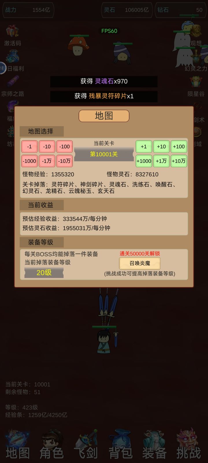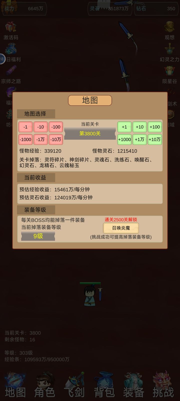 灵石的来源每天就 5 万亿,点个幻灵就要 10 万亿,御剑术直接点不起,就只能升升飞剑过过日子,飞剑每天也点不了几下,关卡和炎魔都瓶颈了,换个灵石套要掉几百关,还不如全攻击力,打高级关卡加的灵石多。。。。