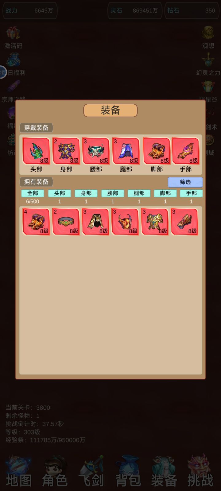 还是得洗最终伤害,6件装备全洗出来轻松过8,平时挂机带灵石加成套嘎嘎爽