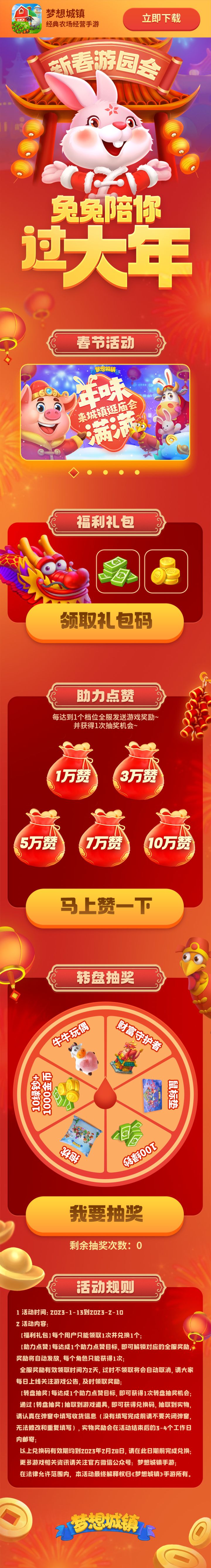 福兔庆新春特别版本将于1月16日开启更新,相关的活动也将在春节假期间逐一上线,大家可以期待起来啦~ 同时,村长也为村民们准备了一个特别的福利活动——新春游园会! 请关注官方微信公众平台:梦想城镇手游,回复【新春游园会】即可参与活动,领取丰厚奖励~