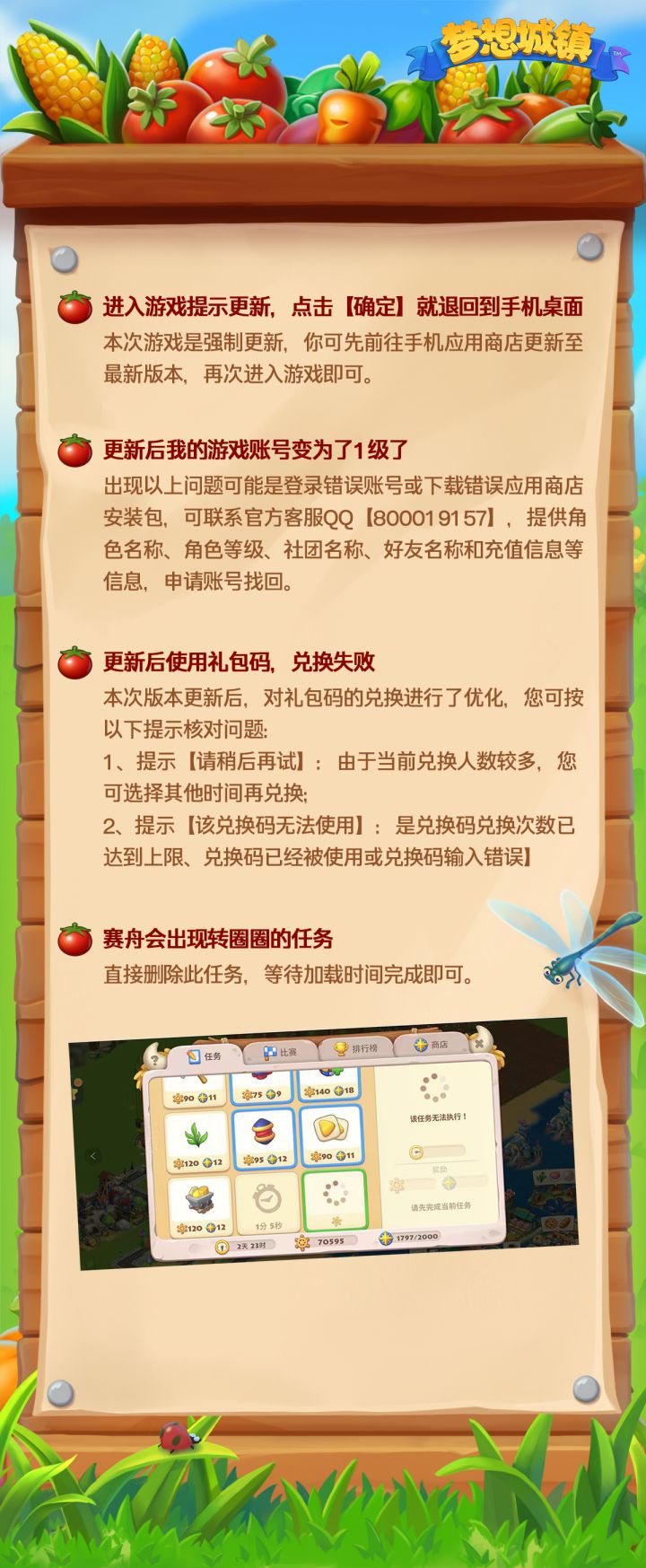 Dear 小镇村民们: 【梦想城镇】1260版本可能会有玩家遇到图内问题,可根据问题类型查看对应解决方式;