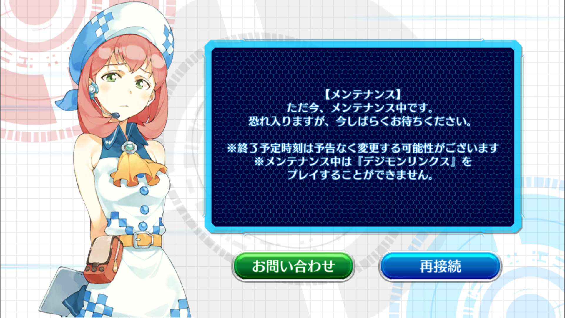 曜日全部开放[保持时段] 8/7(星期一)16:00大约8/21(星期一)15:59时召开期间如有变更,恕不另行通知。※在活动结束的时候,因为它返回到一次标题更新,正在举行,你有问的理解与合作期间,每周任务的每一天将被打开。在此之际,让我们发展自己喜欢的数码宝贝我们。感谢您使用数码宝贝链接“我要告诉你的是,更新已经完成。[更新完成日期] 8/7(星期一)1 6点[更新内容],UI的修