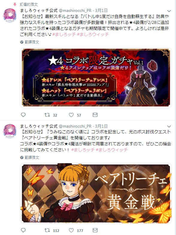 SQUARE ENIX旗下手機遊戲純白魔女原定於今年2月27日開始海貓鳴泣之時合作活動,但在維修期間經過營運團隊發現重大問題,將延長維修,總計維修時間27小時,台灣時間2月28日14:00終於正式開始。【合作開始記念影片】【合作記念「4星合作限定轉蛋Vol.1」】【合作記念「step up轉蛋Vol.1」】【光屬性BOSS活動「ベアトリーチェ黃金戰」開催】【活動概要】【