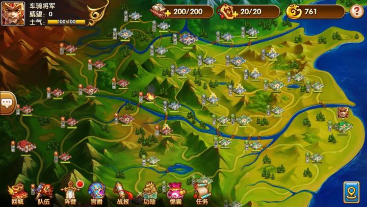 末将潘凤!参加各位主公!天下三分,谁主沉浮。在三国争霸中(抢地盘!),所有玩家将根据所属国家划分为魏、蜀、吴3个势利,通过击败其他势利的玩家、占领城池等不断积累功勋,换取丰厚奖励。一、地图说明国战初始,每个势利都拥有15座城池,其中,红色代表蜀国,蓝色代表魏国,绿色代表吴国,攻占其他势利的城池后,对应城池将归属于最后攻下该城池的玩家所属势利。二、资源说明1、军粮:每次对敌方发起进攻都需要