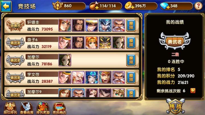末将潘凤!参见各位主公!竞技场,是男人的舞台!是展露威力的时候!当我们等级达到16级时,游戏会开放竞技场系统,个人建议等你每天可以强化的都强化得差不多的时候再来挑战;不然,有可能发现对手都比较强,打不过还浪费你的挑战次数.竞技场每天有10次免费挑战次数,也可购买挑战次数,挑战次数重置时间为每天凌晨3点。 竞技场最左边为竞技场排名前10名玩家相关信息,对于我们最主要的作用就是查看并参考他们的阵