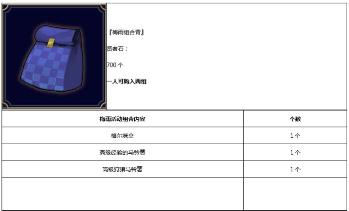内含可爱雨伞的梅雨组合。再次返场!贩卖时间:2019年11月30日00:00~12月6日23:59商品看这边!『梅雨组合』可以在哪边购买呢?『梅雨组合』将于商店中贩售! 前往商店的移动方法:游戏内左侧『选单』>画面左上的Banner>画面右下的『商店』注意事项购入后的道具,将会直接追加至道具栏中而非放入礼物盒。充值奖励双倍!活动时间:2019年11月30日00:00~12月6日23