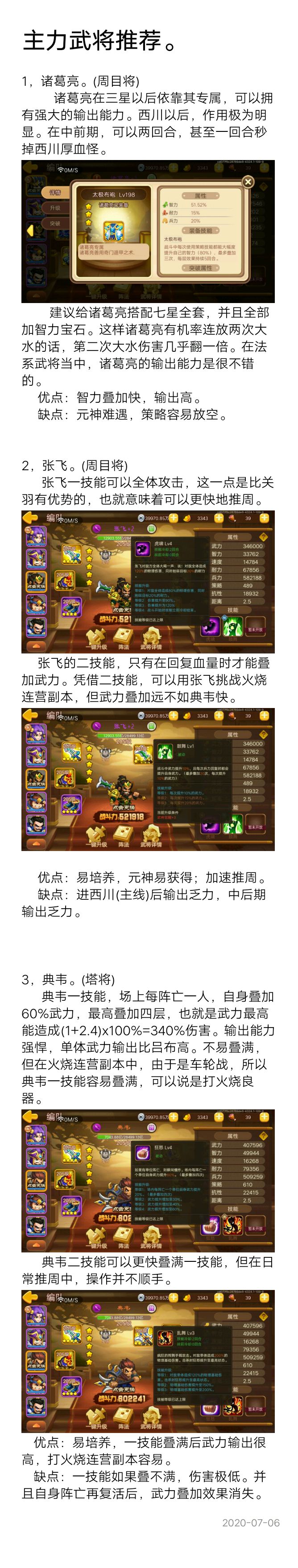 1,早期主力武将推荐【只是建议,仅供参考。】 以上是建议新手培养的三个输出武将【仅供参考,具体按玩家想法】,当然还有很多可以用并且很好用的武将,就比如马超【百分比伤害】等武将,是后期必备的。 2,早期阵容。 因为新手玩家在早期并没有一个完整且合理的推周阵容,并且装备不全,稍稍主线剧情推的快些,可能会出现打不动的现象。所以建议新手玩家在早期多刷些怪提升等级。六十级之后,把战吕布,典韦的装备刷完,