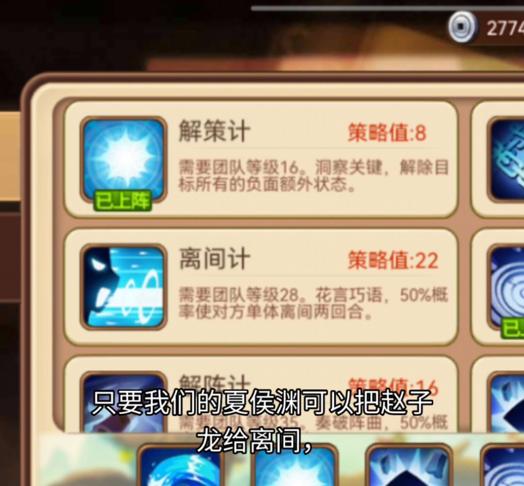 +2姜维配黄月英就是说全体疑心,等着司马懿和觉醒马超全体扣血,那么没+2姜维的思路就是离间敌方,让敌方高武力自己揍自己,这时候徐晃乐进基友组合必上,庞统大多数回合必上,貂蝉上,法师关就上贾诩,一星就行,50关已经全部通关45关利用夏侯渊减速,曹仁嘲讽,姜维给免击,月英给徐晃减cd,不停的封魔免击离间(另外告诉你们一个恶心的地方,如果敌方已经中了离间或者庞统的离间,貂蝉再开大如果成功了,那么敌方不会