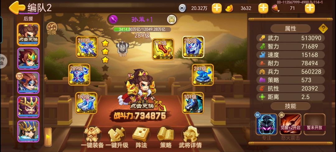 我个人常用的编队配置,给大家分享一下。 第一张图是编队一,推周用,庞统鞋子附魔涌泉,孙策附魔沉沙,开局运气好就秒了,更本不需要点技能,没有的话技能全点基本一回合过。 第二张图是编队二,打幻境用,庞统鞋子附魔涌泉,典韦用酒套穿云头附魔沉沙,点总共就行,典韦被动叠满,一戟全死,庞统收割。 第三四张图是编队三,前队刷品行,一个老虎,一个暴民,一个拯救施工队长,一个江夏城间谍。打完这四个勇气值32。寻找消