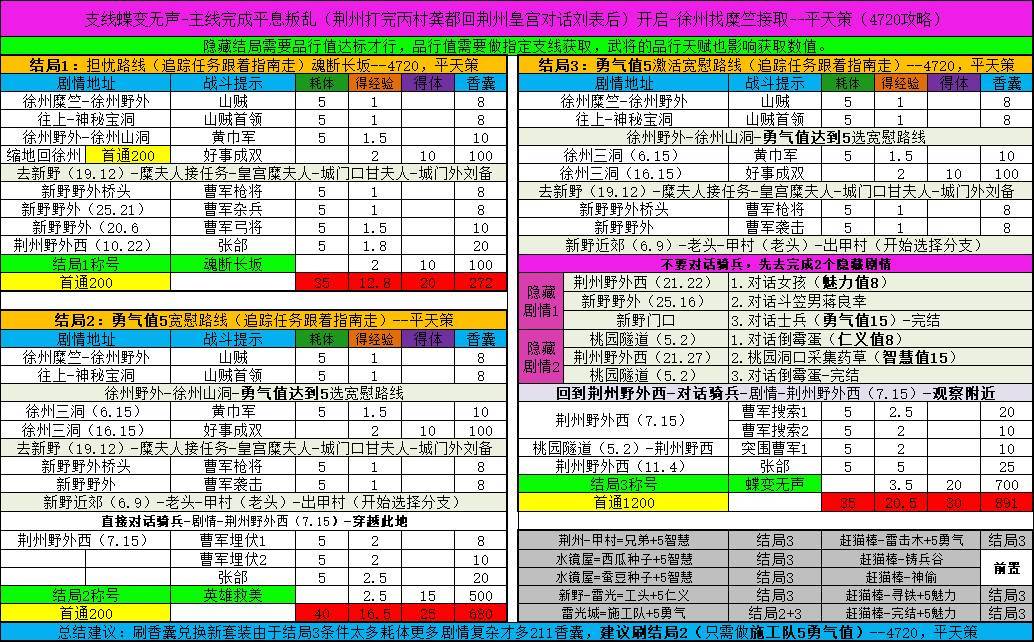 打结局3,发现要满足的条件太烦了,很次都要找武将换武将。但认真研究了一下,道义值不需要太高满足就行。所以想用一个阵容,就可以获得任务所需要的道义值。首先,魅力值和智慧值,只要完成任务没有减值的武将,基本不用去管。所以就剩下勇气和仁义。勇气是两次结算,只要有2个武将合计+3就行,比如:大刘+张飞。仁义只有一次结算,所以务必+3以上。比如:刘备+华佗。所以队伍最终在补一个不减的武将就行了,不用来回切武
