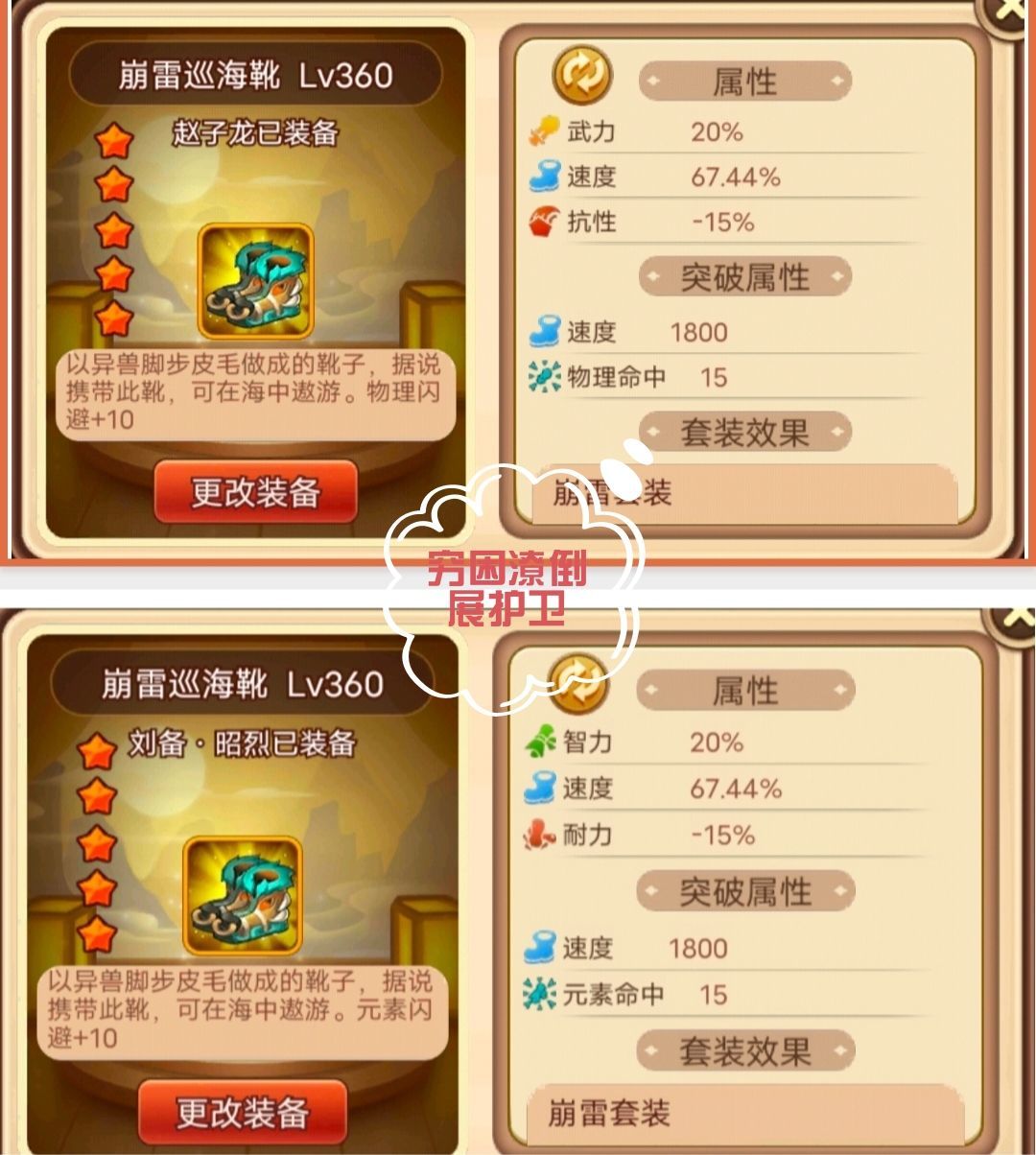 大家好我是渣渣新手展护卫,距离上次出新深渊兽套装已经时隔一年。 新的套装崩雷套,随着版本更新也已经加入游戏,下面就来个大给做个简单的介绍吧。首先,该套装跟狼套兽套一样,通过幸运转盘使用兵者符获取,可转换成武力套或者智力套,物法双修;下面就先来看看每个部件的属性吧。 1,崩雷巡海鞋,20%武力/智力加成,10物理/元素闪避;突破与其他战鞋效果一致,10星1800速度与物理/元素命中15。突破5星即可