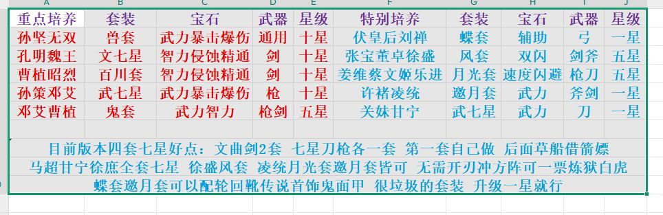 一 武将培养 第一图已经列出该要培养的武将,无双请无视,新手最好存玉龙嫖瑞凌,前期碰到这些元神最好都要买,前期孔明,中期曹植,大后期神将天下,曹植瑞麟打圣兽,无双打群雄守卫。 二 副本征服顺序 1,125级可打赢枫林幻境,八卦阵金赵云即可,弄一套七星给孔明 2,175级七星套孔明,冲方阵长蛇阵过火烧夷陵,需要加二乐进 3,175级七星套孔明,加二乐进,长蛇阵可过130精英塔嫖元神碎片 4,175