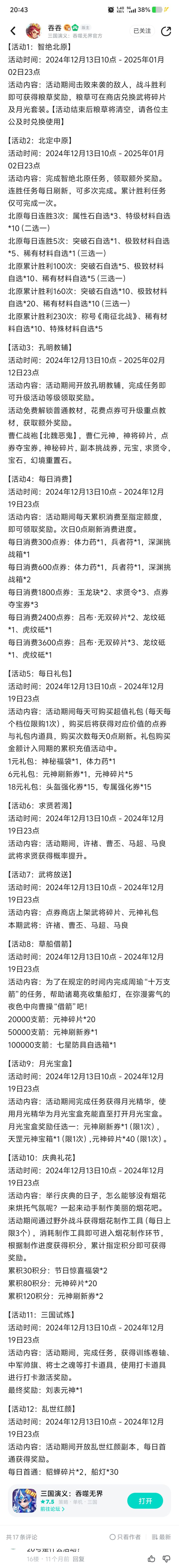 看看以前的活动,看一下现在的活动,越来越抠了,你抠门,我们也抠门,没见过哪个游戏10周年庆活动这么垃圾的,副本越来越难,说好的降低难度呢?真降低了吗?应龙,新出来的副本,哪个不是为了主推新武将,以前的武将被削成狗了,大姜因为曹植的机制被限制成什么样子了?给大姜充钱的人就不是人了,背刺玩家,以前那种消费600点券给两个兵者符的好活动为什么不能返厂?为什么剧情一直没得到更新,是因为策划脑子里面全是浆糊