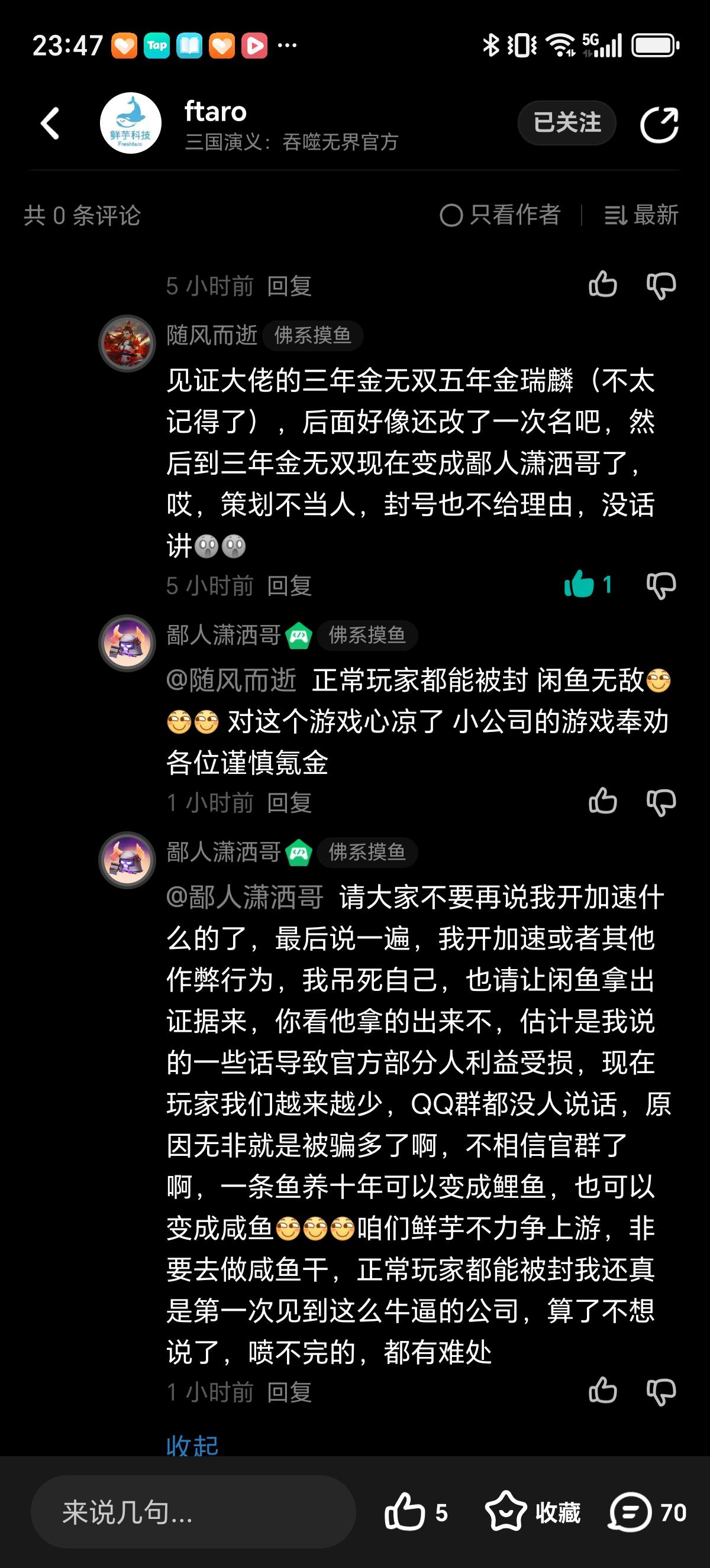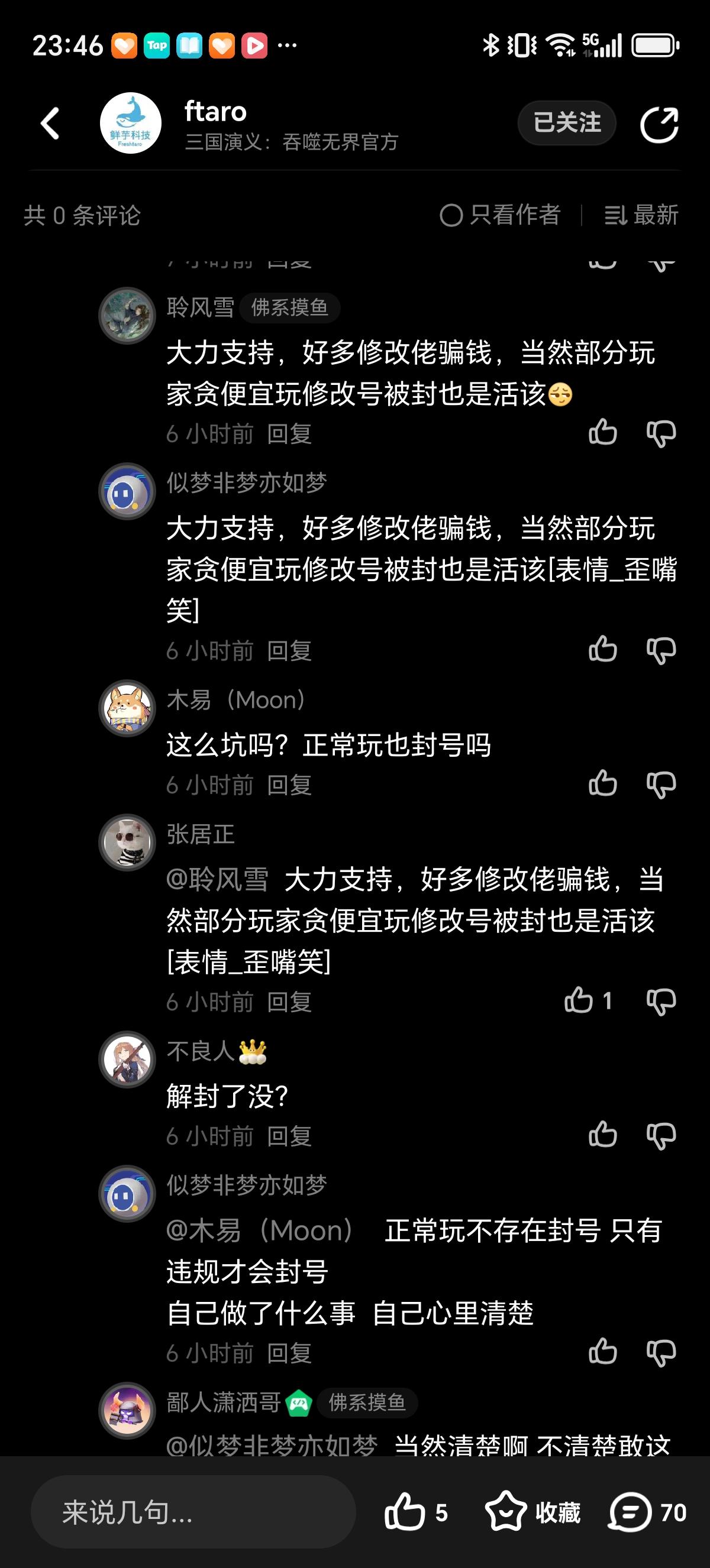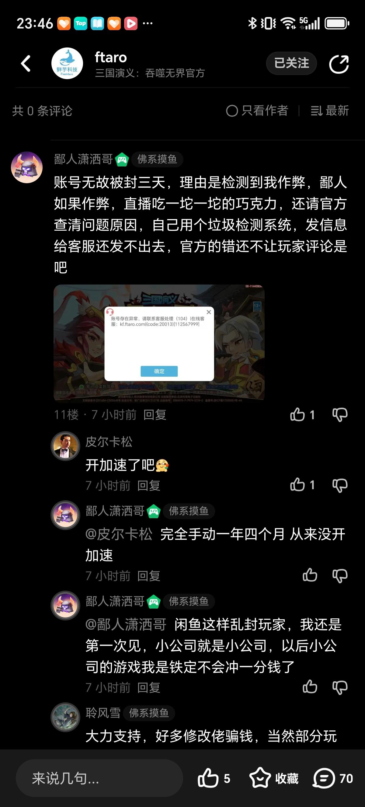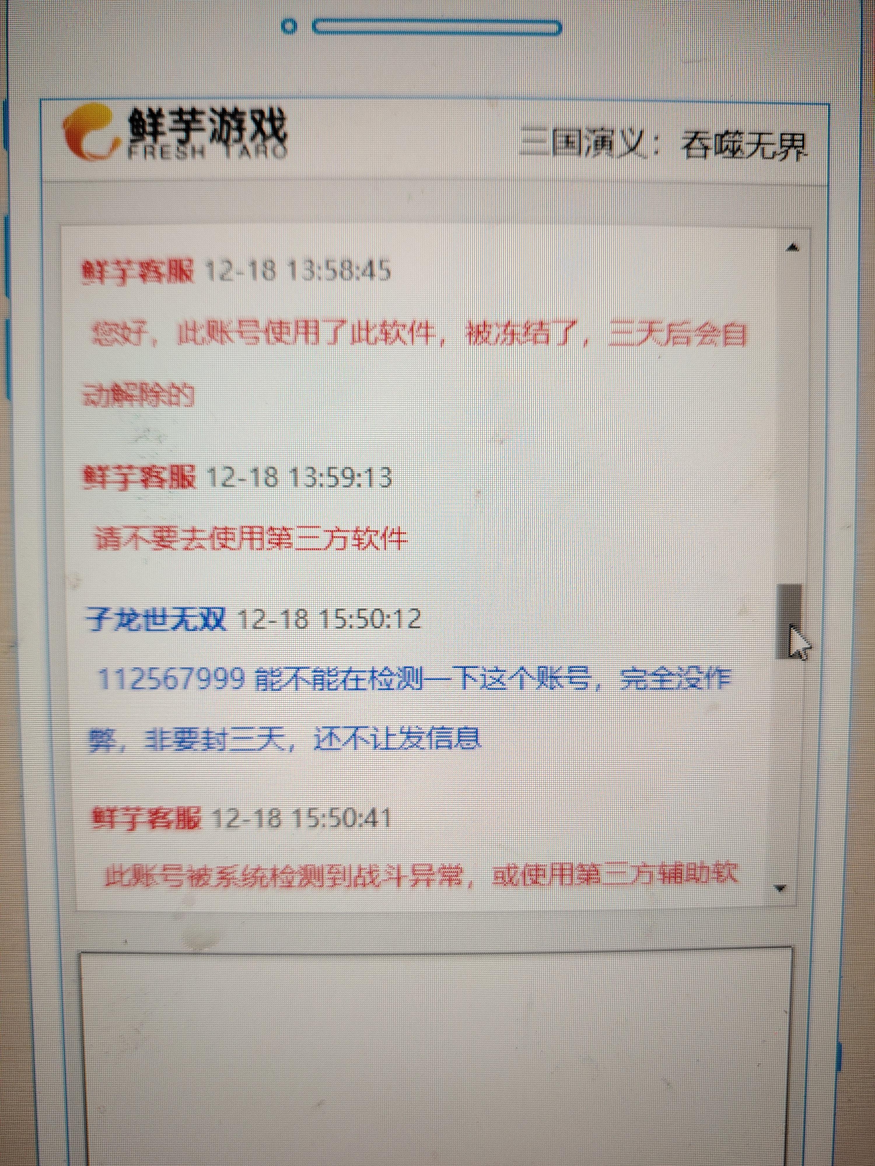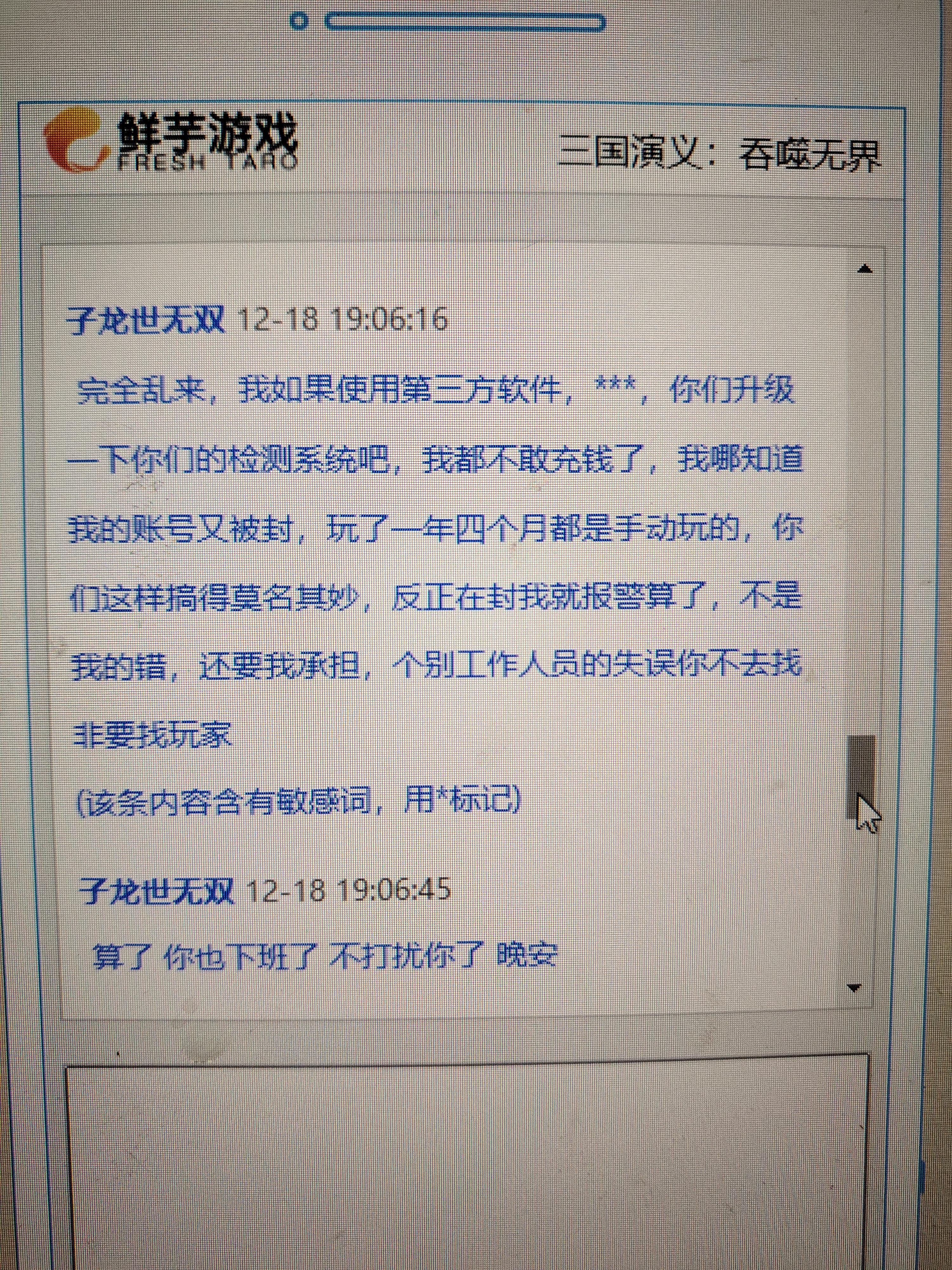 接触吞噬无界这个游戏一年四个月 觉得这个游戏收收菜养养老慢慢培养也蛮不错的,哪知道今天中午账号突然被封了,反馈给客服,这是谈话内容,你们可以看一下我就想质问一下鲜芋,如果你说我用了虫虫,我的手机就没有安装过这个软件,怎么可能会用到,完全是某个管理者的人为,而且这个管理者我还有他微信号,他如果能看到也知道我在说他,还一直在我们吞噬无界平民群,实在不想点穿,毕竟有些东西我看破不想说破,能让管理者认识