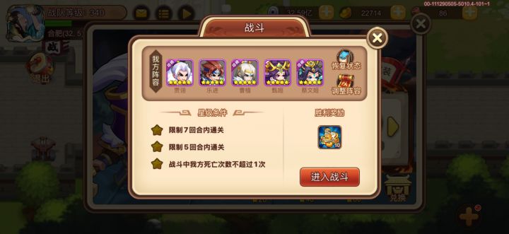 忘记给月英风套了,四蝶套兵力太低抗不住。18回合阵亡了,19回合给复活了,20回合又阵亡了,曹植最后出手没吃到鹤翼阵的加成,差一丢丢