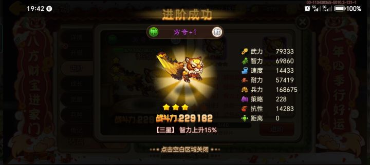 刚刚拿到白泽旗旗,经过2天的磨合,终于找到节奏了。 顺便再说一句,现在对兵种要求真的高,曹植副兵种13,死活一票92%。诸葛亮自己没兵种,靠辅助32兵种,一次就过了。 最后祝大家新年快乐,祝各位平民玩家早日一票应龙[表情_比心][表情_比心][表情_比心]