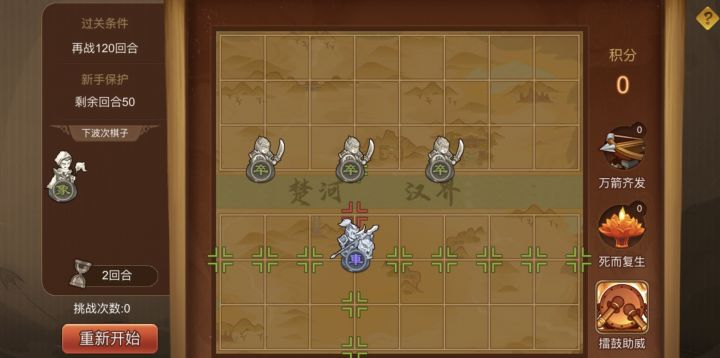 很多人质疑,策划说的平均每局800分是不可能,经过我个人实测,800是可以做到的,但需要运气,也需要很好的棋感,好在这个游戏可以反复玩,只是很浪费时间,尤其是对象棋不熟悉的人来说,800分难度非常大。下面讲一讲其中的技巧及思路。一是要先了解规则。这里所有的棋子都是按照象棋规则来走的,比如马走日,象走田,炮打隔山子,车走一条线,士斜着走,将和卒走相邻一格。明白这个以后,新手回合系统是有提示的,红