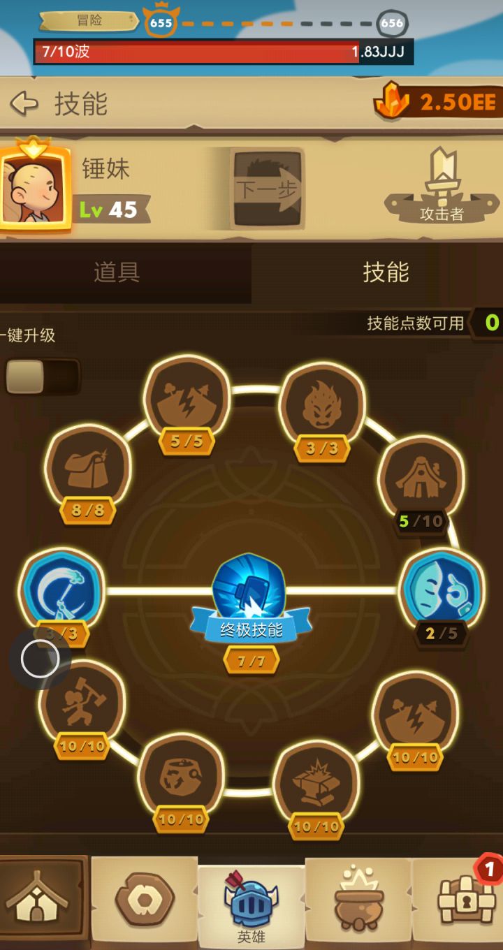 阵容,真的是一个阶段一个阶段不同。第一套阵容就是弓娘加胖锤大概打到300来关。因为前期属性肯定是不高的其他就带加金币属性的英雄比如贼,锤妹。第二套阵容就是锤妹加胖锤大概能打到600关。前期是不可能600关的,属性不够光阵容没用,锤妹输出挺吃属性,所以不推荐一开始就锤妹。属性就不多说了大家看精华贴。其他英雄必出的刀男,很多人觉得刀男很费,其实不然,刀男神技是减甲貌似有叠加,所以你会发现有些打不过