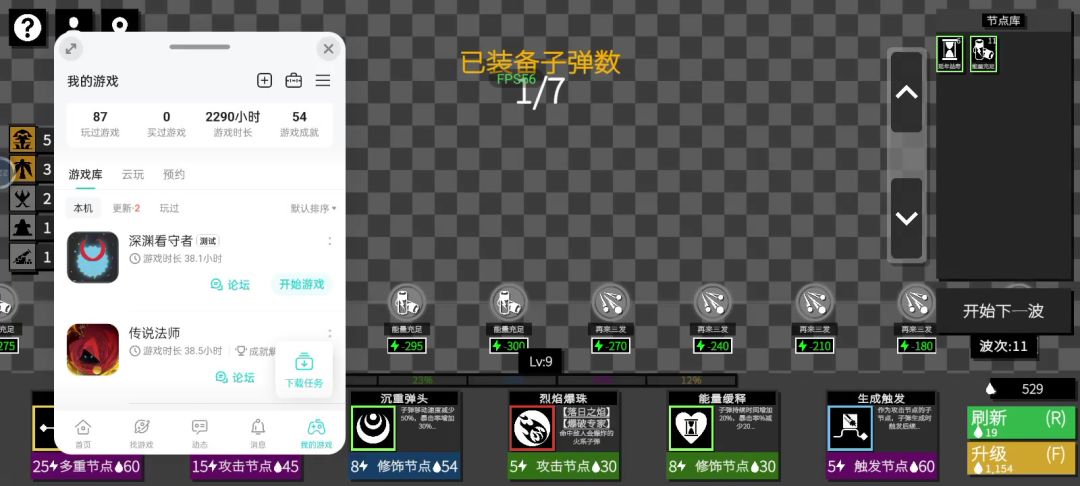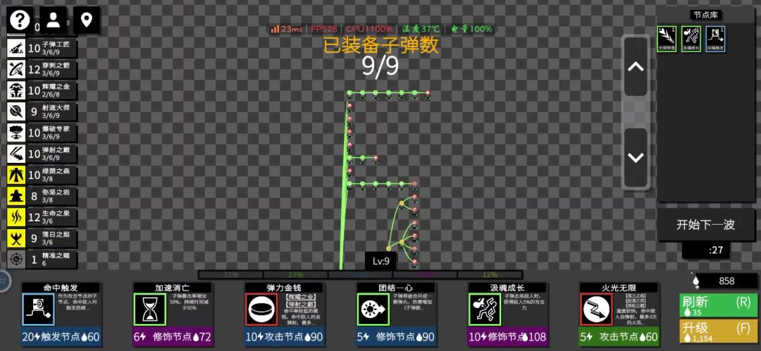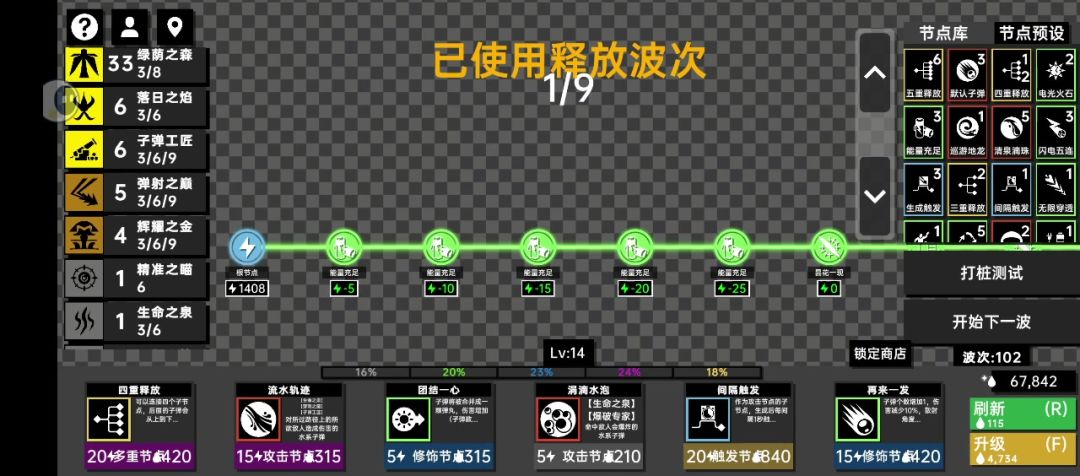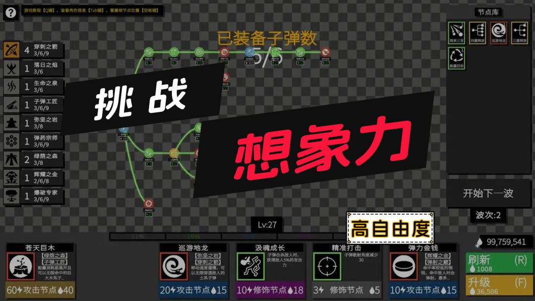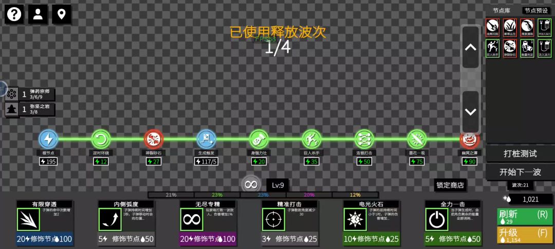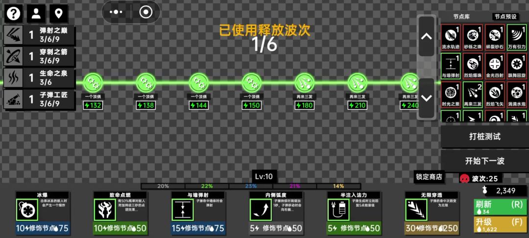 1.前期尽量凑到子弹宗师9,一颗子弹变4颗 2.中期尽量把子弹宗师,绿荫之森等等凑齐 3.多个命中触发+能量回收可以实现无限能量 4.大后期可以尝试弄一条支线连根支线,容易调整技能 其他:后期得控制技能数量,和别选爆炸,不然60关后越来越卡#攻略