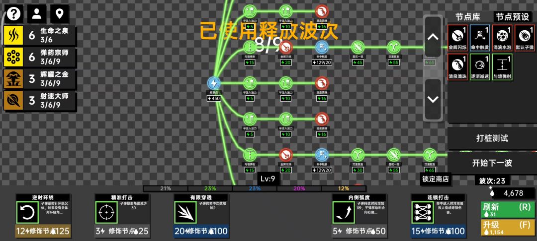 昙花一现的1000%伤害可以覆盖掉触发节点的-85%伤害,虽然子弹只能存在1秒但是可以用金碧辉煌的子弹高速的特点,快速利用命中触发接昙花一现和6子弹宗师多个子弹(还用了沉重扩散的+50%暴击伤害、身强力壮的+10伤害),天赋前期选攻击力加1,后期提升最大体力值来提升节点子弹属性和提升血量保生存,子弹宗师的垫子轮次就用来续航了,多个子弹可以多次触发法力注入
