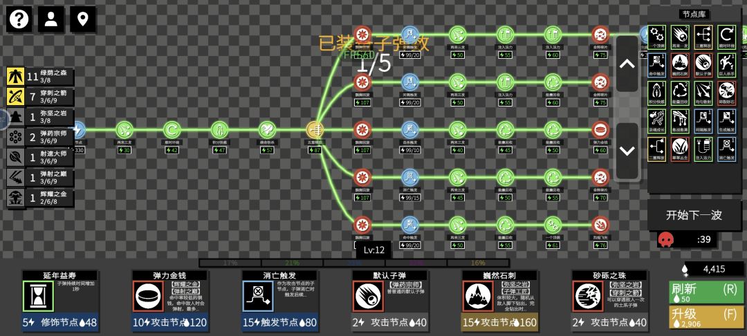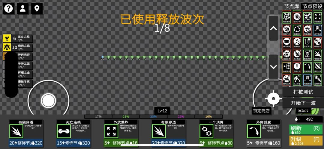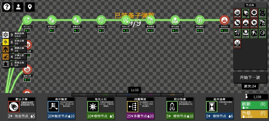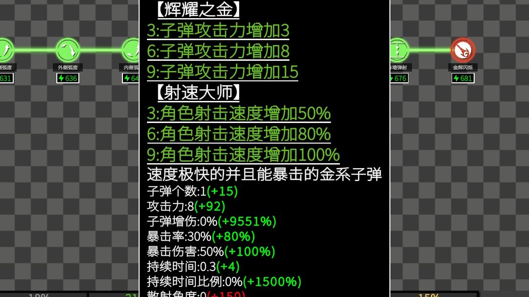 重点是八发子弹的金色子弹,还有生成恢复能量、与墙壁弹射、无限穿透、每秒加子弹速度,以及升级时选的只链接一个子弹的话加百分百的伤害和持续时间 然后啥加子弹伤害、数量、持续时间,啥减能量的也都可以有,升级时的加能量上限、射速也是,我没太研究搭配,反正应该无敌了,但理论上来说还可以更无敌很多,比如子弹持续时间大于等于关卡持续时间之类的,并且可以不选子弹爆炸.....刚开始还好,后面好卡 绿荫之森还没齐,
